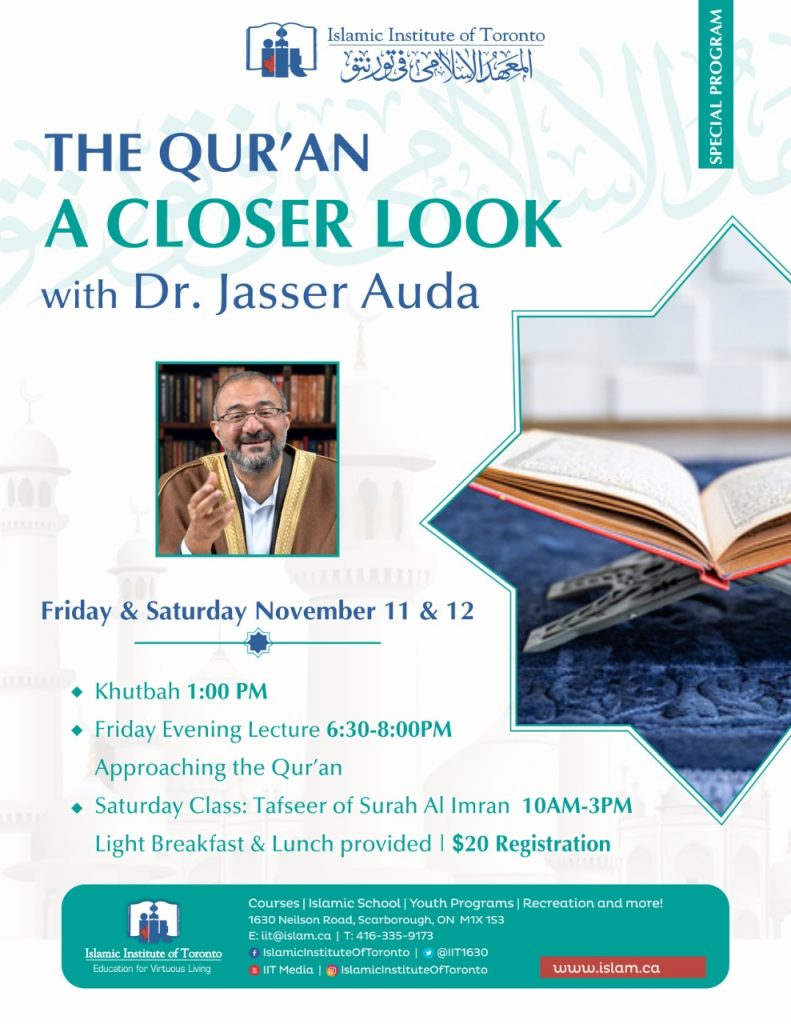 With Dr. Jasser Auda Khutbah – Nov. 11, 1 pm Fri. evening lecture: Approaching the Quran – Nov. 11, 6:30-8 pm Sat. class with light breakfast & lunch: Tafseer of Surah Al-Imran – Nov. 12, 10 am – 3 pm ($20, registration required) Friday Night Lecture: Approaching the Qur’an Reflecting upon the Quran is a […]