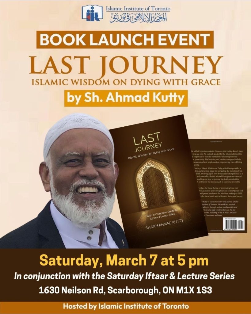 This will be a special lecture & iftar, featuring the launch of Shaikh Ahmad Kutty’s new book, Last Journey: Islamic Wisdom on Dying with Grace. A practical and thoughtful guide on preparing for life’s final journey with faith and dignity.