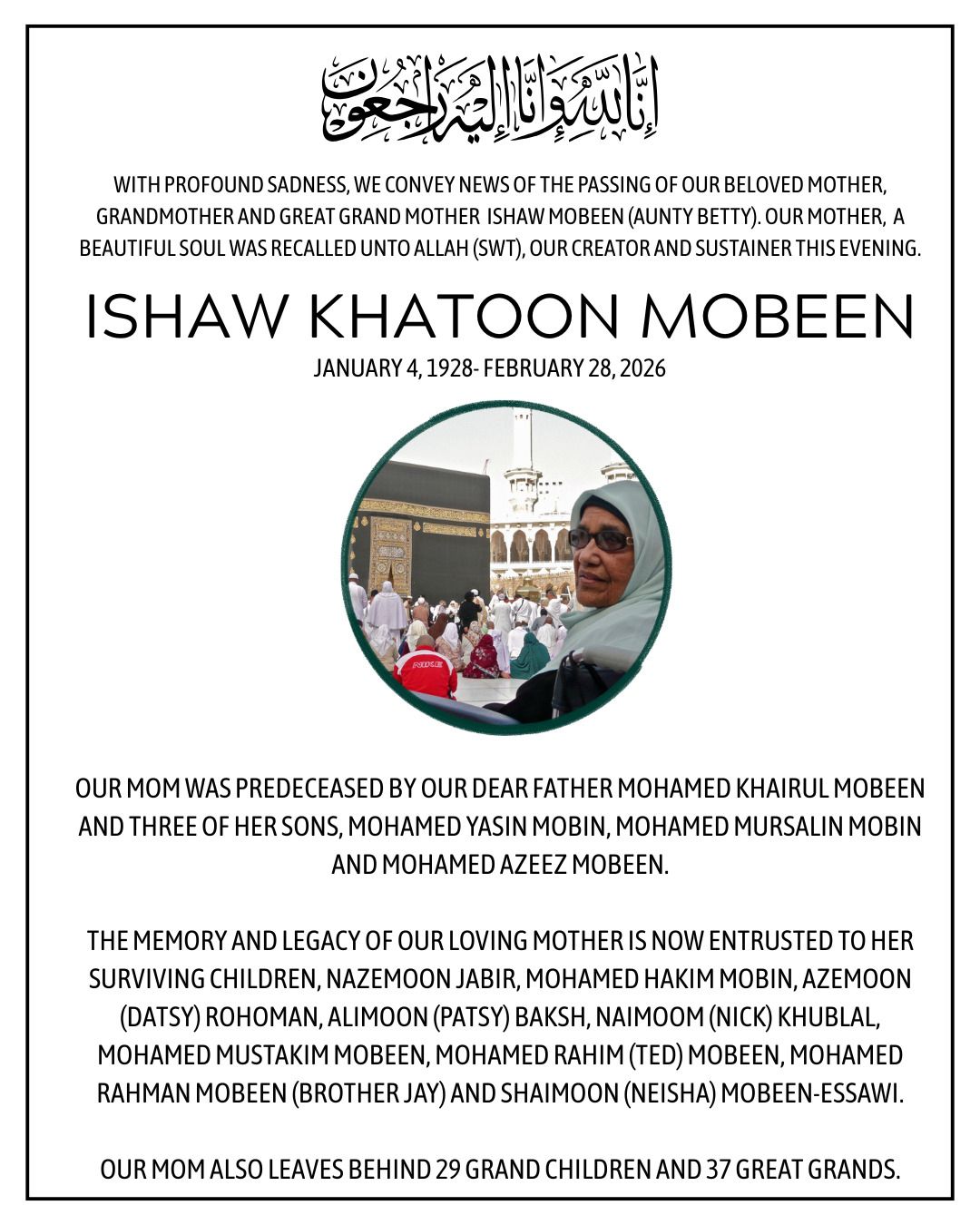 With profound sadness, we convey news of the passing of our beloved Mother, Grandmother and Great Grand Mother Ishaw Mobeen (Aunty Betty). Our Mother, a beautiful soul was recalled unto Allah (SWT), our Creator and Sustainer this evening.