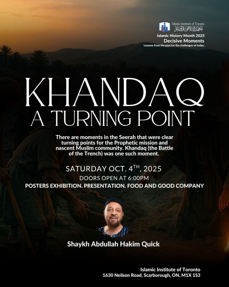 There are moments in the Seerah that were clear turning points for the Prophetic mission and nascent Muslim community. Khandaq (the Battle of the Trench) was one such moment. Join us this Saturday as we explore the events that led to the defeat of the coalition forces that were bent on destroying the growing Muslim community in Madinah.